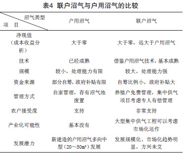 通過以上經濟、技術、社會三方面可行性的分析,可以得出聯戶沼氣相對傳統戶用沼氣的優勢非常明顯,歸納如表4所示。與戶用沼氣相比,聯戶沼氣的規模化程度較高,政府資金支持渠道多,管理較為便利,凈收益更大(凈現值的角度),農戶接受度高,技術和市場的創新空間大,優勢明顯,發展前景更為廣闊。