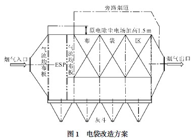 利用(yong)(yong)原(yuan)有電(dian)(dian)(dian)(dian)除(chu)(chu)塵器的(de)混凝土基(ji)礎(強(qiang)度(du)已經過校核(he)) ,保留(liu)混凝土框架(jia)以上的(de)灰斗、電(dian)(dian)(dian)(dian)除(chu)(chu)塵鋼結(jie)構(gou)支柱(zhu), 修復殼(ke)體(ti)、灰斗、進(jin)出(chu)口擴口,拆(chai)除(chu)(chu)本體(ti)內部(bu)(bu)及頂部(bu)(bu)構(gou)件。在原(yuan)1 電(dian)(dian)(dian)(dian)場內仍采(cai)用(yong)(yong)電(dian)(dian)(dian)(dian)除(chu)(chu)塵方(fang)式(shi)(shi)(電(dian)(dian)(dian)(dian)區(qu)(qu)(qu)) 3 分(fen)(fen)區(qu)(qu)(qu)結(jie)構(gou),分(fen)(fen)區(qu)(qu)(qu)方(fang)式(shi)(shi)為(wei)沿煙氣(qi)流(liu)方(fang)向前后分(fen)(fen)區(qu)(qu)(qu),每(mei)個分(fen)(fen)區(qu)(qu)(qu)獨立(li)供電(dian)(dian)(dian)(dian)。同時,為(wei)增(zeng)加電(dian)(dian)(dian)(dian)區(qu)(qu)(qu)收塵面積和降低煙氣(qi)流(liu)速(su),殼(ke)體(ti)在原(yuan)基(ji)礎上加高(gao)1. 5m。在原(yuan)2 電(dian)(dian)(dian)(dian)場、3 電(dian)(dian)(dian)(dian)場、4 電(dian)(dian)(dian)(dian)場的(de)區(qu)(qu)(qu)間內采(cai)用(yong)(yong)布(bu)袋除(chu)(chu)塵方(fang)式(shi)(shi)(袋區(qu)(qu)(qu)) ,16 個分(fen)(fen)室結(jie)構(gou), 布(bu)袋沿氣(qi)流(liu)方(fang)向布(bu)置(圖(tu)1) 。袋區(qu)(qu)(qu)采(cai)用(yong)(yong)低壓脈沖噴吹(chui)方(fang)式(shi)(shi)清灰, 電(dian)(dian)(dian)(dian)區(qu)(qu)(qu)陰陽極均采(cai)用(yong)(yong)電(dian)(dian)(dian)(dian)磁(ci)振打清灰, 通過 PLC 控制。電(dian)(dian)(dian)(dian)除(chu)(chu)塵改為(wei)電(dian)(dian)(dian)(dian)袋組合除(chu)(chu)塵后,除(chu)(chu)塵器本體(ti)阻(zu)力增(zeng)加很(hen)多(至少500 Pa) ,故原(yuan)來的(de)引風機出(chu)力不(bu)能滿足運行(xing)要求,必須(xu)進(jin)行(xing)改造。