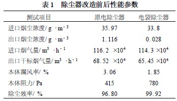 電袋組合(he)除塵(chen)系(xi)統于2008 年5 月(yue)10 日投入運行(xing),運行(xing)狀態穩(wen)定。在工況基(ji)本相似的前提(ti)下,對改造前后除塵(chen)器進(jin)出口(kou)煙氣(qi)的主要參數進(jin)行(xing)測試,結果(guo)見表1 (以一側為例) 。