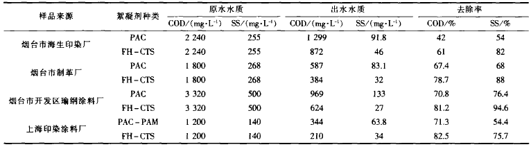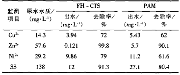 從表(biao)1和(he)表(biao)2可以看出(chu),FH—CTS的主要技(ji)術(shu)指標明顯優(you)于PAM,PAC和(he)PAC+PAM,其(qi)COD,SS 及重金屬離子的去除率(lv)提高10%~20%。