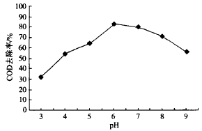 溶(rong)液的pH對殼聚糖的絮凝效果有直接(jie)影響.選上海(hai)市印染涂(tu)料廠廢水作最佳pH實(shi)驗,COD去除率(lv)與(yu)pH關(guan)系如圖1。