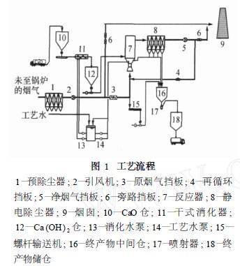 攜帶大(da)量(liang)(liang)吸收(shou)劑和(he)再循環(huan)產物的煙氣(qi)(qi)(qi)從反應器頂(ding)部(bu)排(pai)出(chu),進入(ru)靜(jing)電(dian)除(chu)塵(chen)(chen)器,進行氣(qi)(qi)(qi)固分(fen)(fen)(fen)離。靜(jing)電(dian)除(chu)塵(chen)(chen)器入(ru)口(kou)煙氣(qi)(qi)(qi)含(han)塵(chen)(chen)量(liang)(liang)高達(da)1 000 g·m- 3 ,經(jing)過靜(jing)電(dian)除(chu)塵(chen)(chen)器凈化后煙氣(qi)(qi)(qi)含(han)塵(chen)(chen)量(liang)(liang)不(bu)超過50 mg·m- 3。靜(jing)電(dian)除(chu)塵(chen)(chen)器收(shou)集(ji)下來的灰(hui)中(zhong)含(han)有大(da)量(liang)(liang)未(wei)反應的吸收(shou)劑,因此(ci)將(jiang)大(da)部(bu)分(fen)(fen)(fen)收(shou)集(ji)到(dao)的灰(hui)返回反應器進一步反應,一小部(bu)分(fen)(fen)(fen)灰(hui)作(zuo)為脫(tuo)硫副(fu)產品(pin)排(pai)至終(zhong)產物儲(chu)倉,再通過罐車外排(pai)。經(jing)過靜(jing)電(dian)除(chu)塵(chen)(chen)器凈化后的煙氣(qi)(qi)(qi)經(jing)增壓風機和(he)出(chu)口(kou)擋(dang)板(ban)門后排(pai)入(ru)煙囪。工藝流程(cheng)如(ru)圖1所示。各個子系統的詳細(xi)描述見(jian)文獻[1 ]。