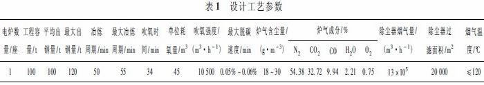 天津鋼管集團股份有限公司二煉鋼節能環保改造項目100 t電爐除塵系統采用了傳統的、成熟的除塵技術,并對生產節能與技術前瞻性做了一定的探討。同時,設備在選型時,著重于系統的長期運行穩定,如風機壓頭的選定,在調試至運行初期,風機實際壓頭小于風機額定壓頭,但從國內各種風機運行1 年后,系統壓頭增大,風機效率降低的情況來看,該工程中風機壓頭有利于系統的長期穩定運行。另外,隨著發達國家對電爐煉鋼時產生二惡英等有毒氣體處理的重視[2],將改進這種傳統的、成熟的電爐除塵工藝。