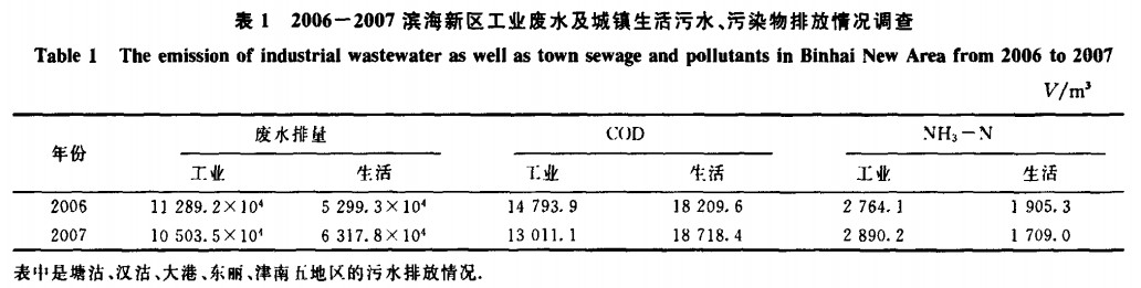 2007年,濱海新區污水排放總量為16736.53萬m3,生活污水排放總量為5712.85萬m3。占全市生活污水排放總量的16.1%,COD排放占全市的21.5%,氨氮排放占全市的30.2%。污水排放量最多的是塘沽、大港和漢沽,其污水、COD和NH3一N排放量之和分別占濱海新區的79.9%,82.8%和86.9%。濱海新區工業廢水及城鎮生活污水、污染物的排放情況見表1。