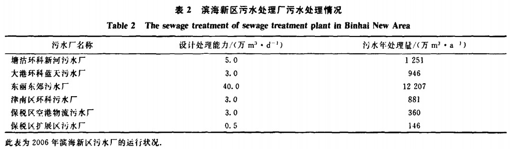 濱海新區污水處理設施主要由3部分組成:首先是城市污水處理廠,負責集中處理城市生活污水和工業廢水;其次是工業企業內部污水處理設施,負責廠區內部工業廢水處理;另外一些住宅小區、機關、賓館污水處理設施,處理內部生活污水并回用。城市生活污水集中處理率約為60N,污水處理廠污水處理情況見表2。