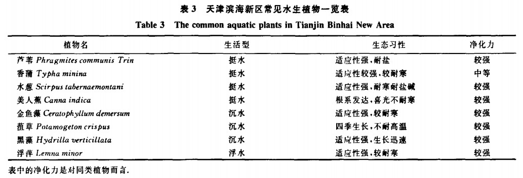 水生植物的優化配置對于提高污水處理效率有重要意義。植物選種應根據濱海新區當地的氣候條件,土壤環境及污水含鹽量高的特點,優先選擇本土物種并考慮是否耐鹽耐寒,合理配置使其具有最佳的凈化效果。天津濱海新區常見水生植物見表3。