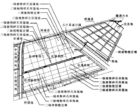 工程從上到下分為(wei)(wei)(wei)(wei)三個(ge)(ge)片區(qu)(qu)(見(jian)圖3):出(chu)流口 與(yu)(yu)高速公路(lu)間為(wei)(wei)(wei)(wei)一(yi)個(ge)(ge)片區(qu)(qu),包(bao)括(kuo)(kuo)應急(ji)池(chi)和(he)一(yi)級(ji)植物(wu) 穩(wen)定塘,處(chu)理規模(mo)按中遠(yuan)期20×10 m /d設計;高 速公路(lu)與(yu)(yu)進(jin)鎮公路(lu)間為(wei)(wei)(wei)(wei)第二(er)(er)(er)個(ge)(ge)片區(qu)(qu),一(yi)區(qu)(qu)出(chu)水經(jing)輸 水涵(han)洞到二(er)(er)(er)區(qu)(qu)進(jin)行處(chu)理,設置4大處(chu)理系統,包(bao)括(kuo)(kuo)一(yi) 級(ji)植物(wu)碎石(shi)床(chuang)濕地、二(er)(er)(er)級(ji)植物(wu)碎石(shi)床(chuang)濕地、二(er)(er)(er)級(ji)生物(wu) 穩(wen)定塘、三級(ji)植物(wu)碎石(shi)床(chuang)濕地和(he)砂濾池(chi);進(jin)鎮公路(lu)與(yu)(yu) 九溪(xi)河之間為(wei)(wei)(wei)(wei)第三個(ge)(ge)片區(qu)(qu),作(zuo)為(wei)(wei)(wei)(wei)中遠(yuan)期處(chu)理用(yong)地,布 置與(yu)(yu)二(er)(er)(er)區(qu)(qu)相(xiang)近(jin)。