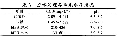 不同(tong)(tong)的水(shui)質(zhi)影響膜通(tong)透(tou)量(liang)的因素也不同(tong)(tong)。該(gai)工(gong)藝(yi)對MBR的進水(shui)COD要(yao)求(qiu)嚴格,這(zhe)就需要(yao)前(qian)期氣浮和(he)生化部分處(chu)理效(xiao)果達到(dao)設計要(yao)求(qiu),保證(zheng)各部分水(shui)質(zhi)濃度的相對穩(wen)(wen)定(ding),特別是原水(shui)水(shui)質(zhi)的相對穩(wen)(wen)定(ding)。為此在(zai)調(diao)節池中增加(jia)了(le)多(duo)(duo)點進水(shui)和(he)多(duo)(duo)點回(hui)流布水(shui)。同(tong)(tong)時增加(jia)了(le) l臺風(feng)機,使(shi)1 200 m 池容的調(diao)節池內COD基(ji)本(ben)在(zai) 3 500 mg/L左右。各生化部分COD去除(chu)率(lv)在(zai)60%左右,B厭氧進水(shui)COD控制在(zai)400 mg/L以下。