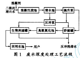 該公司為了實現生態工業示范園區建設的總體目標,擬將廢水進行深度處理后補充回用到循環冷卻水中,以節約新鮮水源,使廢水資源化。目前。廢水深度處理技術有傳統技術、臭氧一活性炭技術和膜技術等。傳統技術占地面積大、操作復雜、出水水質不穩定;膜技術初期投資大、運行費用高、維修管理復雜 ;臭氧一活性炭技術是集活性炭物理化學吸附、臭氧化學氧化、生物氧化降解和臭氧消毒于一體的工藝,處理低濃度難降解有機廢水效果較好[2. ,具有出水水質優、能耗低、運行穩定、易管理的特點[4]。結合該公司廢水二級處理出水的水質情況,本工程采用混凝沉淀一臭氧一活性炭工藝對廢水進行深度處理,其出水滿足了循環冷卻水水質要求,從而實現了該公司廢水的資源化回用,即節約了新鮮水源,又降低了生產成本。