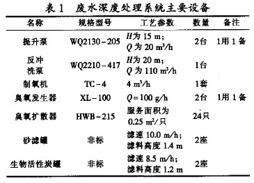 本工程采用以氣態氧為氣源的XL一100型臭氧發生器.氣態氧由制氧機現場提供。該臭氧發生系統操作簡單,運行管理方便,投資低。砂濾罐和生物活性炭罐需定期反沖洗,其反沖洗強度為10~12L/(m2·s);反沖洗歷時5~10min;反沖洗周期24~48h。主要處理設備見表1。