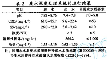 廢水深度處理系統每天產水量約為4O0 m 。日耗電量152.6 kW·h:每天消耗混凝劑約15 kg;由原污水處理站運行操作人員管理,制水成本為O.36元/ms (其中電費0.21元/m3,藥劑費0.11元/m ,檢修維護費0.04元/m3)。