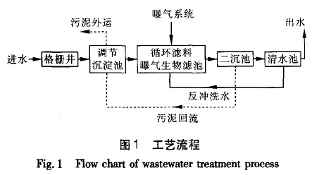工程竣工后,先清水試車,確保整套工藝運轉良好。將接種污泥(來自附近城市污水處理廠)投入曝氣生物濾池,采用間歇進水方式,每悶曝2天換水一次,l0天后采用連續進水方式,水量由0.5 m /h 逐步加大直到滿負荷運行,濾料表面產生一層薄而均勻的灰黑色生物膜。運行1個月后,鏡檢發現許多菌膠團及豆形蟲、鐘蟲等;穩定運行2個月后,生物膜逐漸成熟,厚度約為1 mm,濾料表面附著的微生物分泌膠質粘膜,覆蓋已形成的膜層,膜層不斷增厚且由內向外擴展,最后形成成熟的生物膜。