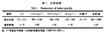 中山市高平織染水處理有限公司處理工業園區20多家 紡織印染廠排放的廢水,設計總處理規模為3×104 m3/d,分 三期建設。目前一期設計規模為1×104 m3/d,已投入運營, 目前日均處理量在9000 m3左右。該廢水具有有機污染物含 量高、色度高、堿性大、硫化物含量高、水溫高、水質水量 變化大等特點,且可生化性差,屬難處理的工業廢水之一, 企業的訂單及季節性生產也使水質參數產生較大變化。其水 質變化參數范圍如表1所示。