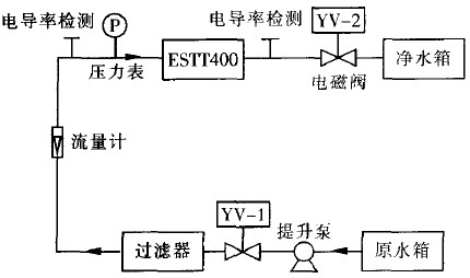 試(shi)驗流(liu)程如圖1所示。將首鋼污水(shui)廠的(de)二(er)級處 理出(chu)水(shui)引(yin)入原水(shui)箱(xiang),由提(ti)升泵(beng)提(ti)升,經過濾器、流(liu)量 計進入電(dian)吸附設備,處理后的(de)出(chu)水(shui)進入回用水(shui)箱(xiang)。 原水(shui)的(de)電(dian)導率為(wei)1 473~1 852 μS/cm,pH值(zhi)為(wei)6~8,總硬度(以(yi)CaCO3計,下同(tong))為(wei)298~439 mg/L,總 堿度(以(yi)CaCO3計,下同(tong))為(wei)57.6~87.4 mg/L ,水(shui)溫(wen) 為(wei)24~35℃ 。其他主(zhu)要指標見表1。