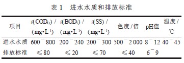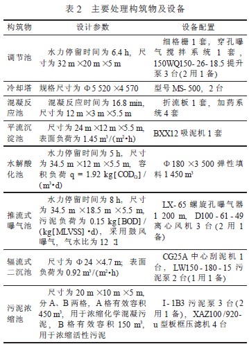 來自各生產車間的廢水經格柵去除較大顆粒雜質后流入調節池, 均質均量后, 由污水提升泵提升進入污水冷卻塔進行降溫; 降溫后的廢水流入混凝反應池, 同時投加混凝劑及助凝劑, 混凝反應后流入平流沉淀池, 沉淀除去大部分的非溶解性污染物。沉淀池出水進入水解酸化池, 水中難降解的有機污染物在厭氧菌和兼性菌的作用下開環斷鏈生成小分子物質, 以利于進一步的處理, 而一部分有機物降解為無機小分子, 水解池出水進入推流式曝氣池, 通過曝氣充氧, 水中有機物被好氧微生物菌絮凝吸附、氧化、分解, 然后進入二沉池沉淀, 出水達標排放。