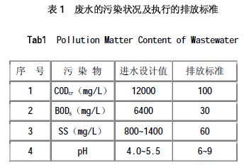 該淀粉廠廢水主要來源于生產過程中的工藝廢水(主要包括蛋白液、中間產品的洗滌水、各種設備的沖洗水等),廢水中有機物含量較高,CODcr含量為 12000mg/L, BOD5/ CODcr =0.53,可生化性較好。廢水處理工程的設計規模1000m3/d,處理后水質要求達到《污水綜合排放標準》(GB8978—1996)一級排放標準,進水水質和排放標準見表1。