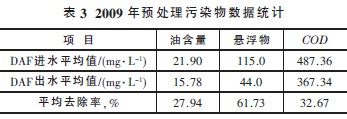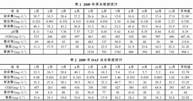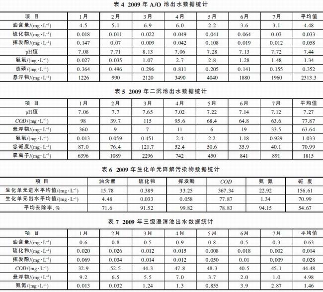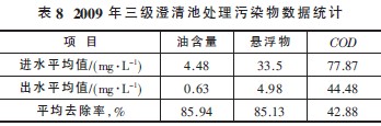2009 年,污水場二期原水數據統計(ji)見表1;DAF 單(dan)元(yuan)運(yun)(yun)行效果見表2~3;生化處(chu)理單(dan)元(yuan)運(yun)(yun)行效果見表4~6;深(shen)度處(chu)理單(dan)元(yuan)運(yun)(yun)行效果見表7 和表8。