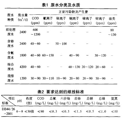 高平電鍍污水處理有限公司于2003年3月在一、二期建設的基礎上改擴建第三期工程,承擔園內規劃的25家表面處理企業的工業廢水集中處理任務,規劃處理能力1.2萬m3/d。電鍍廢水分為5類:含氰廢水、含鉻廢水、混排廢水、前處理廢水和酸堿綜合廢水。原水分類及水質見表1,要求達到的排放標準見表2。