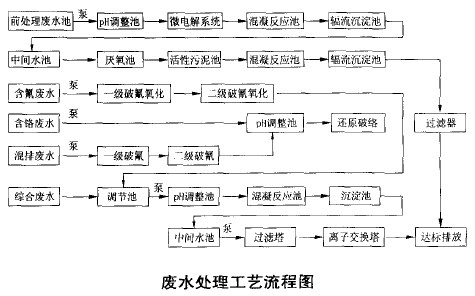 混排廢水主要指鍍槽滲漏、操作或管理不善引起的“跑、冒、滴、漏”的各種槽液和排水;另外還有車間地面沖洗、刷洗極板水等。混排廢水成分復雜,不易控制,由于含氰廢水和含鉻廢水混在一起,故對這部分廢水的處理應先破氰,將氰氧化,然后再還原除鉻。