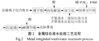 針對最后出水(shui)銅(tong)(tong)元(yuan)素有(you)(you)超標現(xian)(xian)象(xiang)的情(qing)況,對原水(shui)水(shui)質重新進行了(le)化驗、檢測(ce)(ce)、分析,認為5 路廢(fei)水(shui)中含(han)(han)銅(tong)(tong)的有(you)(you)2 路,其中含(han)(han)氰廢(fei)水(shui)水(shui)量(liang)相對較小。檢測(ce)(ce)結果表明,氰的氧化比較徹(che)(che)底,而(er)金屬綜(zong)合(he)(he)廢(fei)水(shui)的水(shui)量(liang)較大(da),廢(fei)水(shui)來源復雜,車間(jian)生產(chan)以手工(gong)勞(lao)動(dong)為主,廢(fei)水(shui)分離(li)工(gong)作(zuo)不夠徹(che)(che)底,除了(le)以自由離(li)子(zi)方式(shi)存在(zai)外,銅(tong)(tong)還可能以絡(luo)合(he)(he)狀態(tai)存在(zai),而(er)現(xian)(xian)有(you)(you)工(gong)藝(yi)沒有(you)(you)對這部(bu)分以絡(luo)合(he)(he)狀態(tai)存在(zai)的銅(tong)(tong)離(li)子(zi)采(cai)取(qu)破絡(luo)措(cuo)施(shi)。經過多次試驗,對金屬綜(zong)合(he)(he)廢(fei)水(shui)處(chu)理工(gong)藝(yi)做(zuo)如圖2 改(gai)進。