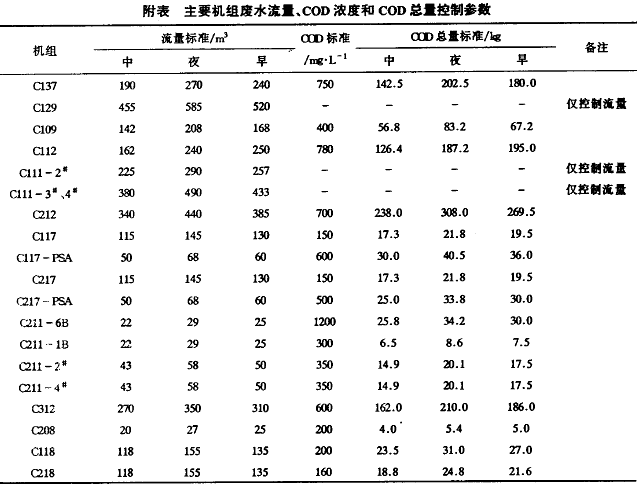 (3)在數據結果出來后,輸入電(dian)腦生成報(bao)表。完成一天(3班)總(zong)量(liang)控制報(bao)表。主要機組(zu)廢水(shui)流量(liang)、COD濃度和COD總(zong)量(liang)控制參數見附表。