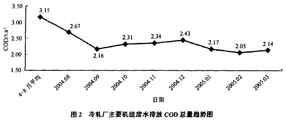 自開始實(shi)簏廢(fei)水(shui)管(guan)理(廢(fei)水(shui)源頭總量控制)以來,通過(guo)流量統計(ji)和(he)COD檢(jian)測,所考察的(de)機組(zu)廢(fei)水(shui)排(pai)放COD總量明顯下降,見圖2。
