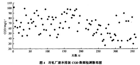 總量(liang)控制實(shi)麓前(qian)后一年來(lai),廢水站最終排放COD檢(jian)測濃度數據分布,見圖4(標準 COD<100 mg/L)。