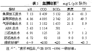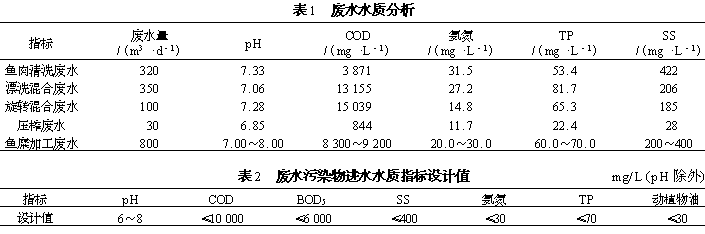 企(qi)業日排放(fang)魚(yu)糜(mi)加工廢(fei)(fei)水(shui)約800 m3 ,包括魚(yu)肉清洗廢(fei)(fei)水(shui)、漂洗混(hun)(hun)合廢(fei)(fei)水(shui)、旋(xuan)轉混(hun)(hun)合廢(fei)(fei)水(shui)和壓榨廢(fei)(fei)水(shui)。廢(fei)(fei)水(shui)水(shui)質分(fen)析見(jian)表(biao)1 ,廢(fei)(fei)水(shui)污染物進水(shui)水(shui)質指標(biao)設計值見(jian)表(biao)2。