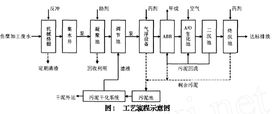 從經濟和處(chu)理效果上(shang)考(kao)慮,最終采用(yong)凝(ning)聚回收— 氣浮—ABR —A/ O 工藝。工藝流程(cheng)見圖(tu)1。