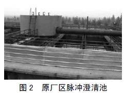 脈(mo)沖澄(cheng)清池共設(she)2座(zuo),混凝區上(shang)升流(liu)(liu)速為(wei)1.2mm/s,清水區上(shang)升流(liu)(liu)速為(wei)1mm/s,進、出水管均采用虹吸(xi)管,設(she)計(ji)濾速為(wei)8m/h。加(jia)(jia)藥(yao)系(xi)統(tong)采用重力(li)投加(jia)(jia),未設(she)助濾劑投加(jia)(jia)設(she)施。加(jia)(jia)氯(lv)(lv)系(xi)統(tong)采用濾后加(jia)(jia)氯(lv)(lv)采用手動加(jia)(jia)氯(lv)(lv)機人工調節加(jia)(jia)氯(lv)(lv)量。圖2為(wei)脈(mo)沖澄(cheng)清池現(xian)場照片。