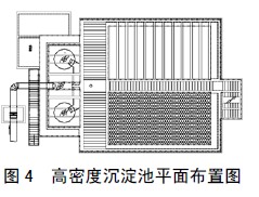 高密度(du)(du)沉(chen)淀池(chi)主要設(she)計參數:設(she)計水(shui)(shui)(shui)量5萬m3/d,設(she)一(yi)座混合池(chi)和兩座絮(xu)凝(ning)池(chi),混合時間為(wei)70s,絮(xu)凝(ning)時間6.5min。斜管(guan)采用無毒乙(yi)丙共聚塑料片熱壓(ya)六邊形蜂窩管(guan),管(guan)壁(bi)厚(hou)為(wei)0.4mm,邊距為(wei)25mm,水(shui)(shui)(shui)平傾角60°,斜管(guan)傾斜高度(du)(du)為(wei)870mm。各區高度(du)(du)如(ru)下:超高為(wei)0.30m,清水(shui)(shui)(shui)區為(wei)1.25m,斜管(guan)區為(wei)0.87m,布水(shui)(shui)(shui)區為(wei)1.18m。絮(xu)凝(ning)反(fan)應池(chi)和沉(chen)淀池(chi)之間設(she)置過渡區,寬(kuan)度(du)(du)為(wei) 2.65m,沉(chen)淀池(chi)底(di)部設(she)置DN200 的(de)排泥管(guan),集(ji)水(shui)(shui)(shui)槽采用不銹鋼集(ji)水(shui)(shui)(shui)槽。高密度(du)(du)沉(chen)淀池(chi)平面布置圖(tu)如(ru)圖(tu)4所示