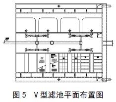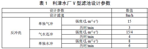 V型(xing)濾(lv)(lv)池(chi)南北方(fang)(fang)向布(bu)置,平面(mian)(mian)尺寸為(wei)(wei)30.85m×25.9m。雙排布(bu)置,每格(ge)濾(lv)(lv)池(chi)的有效面(mian)(mian)積為(wei)(wei) 2×6.3×2.8=35.28m2。每格(ge)濾(lv)(lv)池(chi)安裝18塊933mm×1050mm標準(zhun)濾(lv)(lv)板(ban)。采(cai)用均(jun)質石英砂單層(ceng)濾(lv)(lv)料:有效粒(li)徑為(wei)(wei)0.9mm,不均(jun)勻系數K10=1.40(D80/D10),厚(hou)度為(wei)(wei)1200mm。承托層(ceng)采(cai)用粒(li)徑為(wei)(wei)2.0mm的石英砂,厚(hou)度為(wei)(wei) 100mm。進、排水(shui)閥采(cai)用氣動不銹(xiu)鋼方(fang)(fang)形閘門,并(bing)通過流量調(diao)節閥調(diao)整濾(lv)(lv)池(chi)的水(shui)位(wei)基(ji)本保持不變,避免(mian)濾(lv)(lv)層(ceng)出(chu)現(xian)負壓,并(bing)達(da)到恒水(shui)位(wei)過濾(lv)(lv)的目的。利(li)津水(shui)廠(chang)V 型(xing)濾(lv)(lv)池(chi)設計(ji)參數如(ru)表1所(suo)示(shi),平面(mian)(mian)布(bu)置圖如(ru)圖5所(suo)示(shi)。