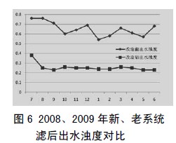 從圖6可以看出,2009年7 月新系統(tong)運行(xing)后,經過2個月調試(shi)運行(xing),濾后水濁(zhuo)度基(ji)本穩定在 0.25NTU左右,其出水濁(zhuo)度遠遠低于(yu)老系統(tong)。