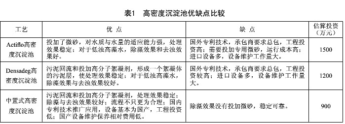 高密度沉淀池是近幾來從國外引進的新池型,國際水處理行業對新型高效沉淀技術的研究和應用引起了較大關注[2][3]。目前,國內應用的高密度沉淀池有三種主流工藝,就民豐水廠改造工程各方面綜合比較如表1。