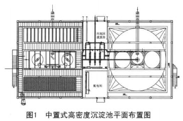 中置式沉淀池組合混合、絮凝、沉淀、污泥濃縮于一體,池體中間上部設置單元機械混合器和機械絮凝器;下部為各類管線走廊;池體兩側為絮凝過渡區、斜管分離區、集水區、污泥濃縮區;污泥回流和污泥排放泵,設在池體端頭。