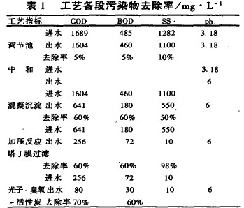 ⑤臭氧對含氰、含酚、含硫廢水都有很好的處理效果,本工藝采用臭氧的目的是對通過上級處理的殘留污染物進一步處理,特別是對水中的酚類進行氧化,以使出水能夠達到規定的排放標準。另外,臭氧可對后級的活性炭起再生劑的作用。本工藝采用臭氧活性炭工藝,既可以解決活性炭的飽合難題,又可以保證出水全部指標達到國家排放標準,工藝各段污染物去除率見表1。