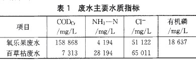 該公司(si)的高濃度(du)有機污(wu)染(ran)廢(fei)(fei)(fei)水(shui)(shui)(shui)主要來自氧(yang)樂果(guo)生產(chan)氯(lv)乙脂精(jing)餾工序洗釜水(shui)(shui)(shui)以及百草枯(ku)生產(chan)廢(fei)(fei)(fei)水(shui)(shui)(shui),廢(fei)(fei)(fei)水(shui)(shui)(shui)水(shui)(shui)(shui)量(liang)約(yue)(yue)(yue)24 m3/d,其中氧(yang)樂果(guo)廢(fei)(fei)(fei)水(shui)(shui)(shui)量(liang)約(yue)(yue)(yue)14 m3/d,百草枯(ku)廢(fei)(fei)(fei)水(shui)(shui)(shui)量(liang)約(yue)(yue)(yue)10 mVd,廢(fei)(fei)(fei)水(shui)(shui)(shui)主要水(shui)(shui)(shui)質(zhi)指標見表1。