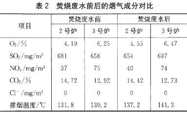 通過近一年的運行實(shi)踐,對(dui)(dui)農藥廠高濃度有機污染(ran)廢(fei)水(shui)全部進(jin)行了焚(fen)(fen)燒處理(li),該系統運行穩定。對(dui)(dui)鍋爐的燃(ran)燒和穩定運行未(wei)造成(cheng)影響(xiang);通過檢修時的觀察,也未(wei)見(jian)對(dui)(dui)空氣預熱器(qi)、煙(yan)道和靜電除(chu)塵器(qi)等設備的腐蝕影響(xiang);對(dui)(dui)比焚(fen)(fen)燒廢(fei)水(shui)前(qian)后的煙(yan)氣成(cheng)分 (見(jian)表2),未(wei)見(jian)有明(ming)顯變化,對(dui)(dui)煙(yan)氣達標排放不造成(cheng)影響(xiang)。循環流(liu)化床焚(fen)(fen)燒法(fa)成(cheng)本低、易操(cao)作,證(zheng)明(ming)具有較強的實(shi)踐可(ke)操(cao)作性。