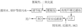陜(shan)西(xi)某熱電廠(chang)(chang)(chang)廢水(shui)(shui)主要來源于(yu)工業(ye)循(xun)(xun)環冷卻水(shui)(shui)和鍋爐排(pai)(pai)水(shui)(shui),廢水(shui)(shui)中(zhong)離子含量較高。為使排(pai)(pai)污(wu)(wu)水(shui)(shui)得到循(xun)(xun)環利用(yong),該廠(chang)(chang)(chang)建成1 套(tao)反滲透(RO)系(xi)(xi)統(tong)用(yong)于(yu)排(pai)(pai)放(fang)污(wu)(wu)水(shui)(shui)的(de)(de)處理,以期實(shi)現節約(yue)資(zi)源、降低成本的(de)(de)目的(de)(de),然而新建成的(de)(de)RO 系(xi)(xi)統(tong)在(zai)正常(chang)運轉了(le)一段時(shi)間后,出現了(le)嚴重的(de)(de)污(wu)(wu)堵(du),甚至無法完成72 h 連續運行(xing)(xing)(xing),系(xi)(xi)統(tong)幾近全線癱瘓。受該廠(chang)(chang)(chang)委托,中(zhong)海油天津(jin)化工研究設計院針對該廠(chang)(chang)(chang)RO 系(xi)(xi)統(tong)中(zhong)出現的(de)(de)污(wu)(wu)堵(du)問(wen)題及(ji)其(qi)廢水(shui)(shui)處理工藝特點,對其(qi)RO 系(xi)(xi)統(tong)進行(xing)(xing)(xing)了(le)改造和調整,在(zai)RO 前增加(jia)了(le)1 套(tao)前處理裝(zhuang)置,起(qi)到保護后續RO 工藝穩定(ding)運行(xing)(xing)(xing)的(de)(de)作用(yong),并最(zui)終解決了(le)RO系(xi)(xi)統(tong)的(de)(de)污(wu)(wu)堵(du)問(wen)題,實(shi)際運行(xing)(xing)(xing)時(shi)處理后的(de)(de)污(wu)(wu)水(shui)(shui)作為補充(chong)水(shui)(shui)回用(yong)于(yu)冷卻塔循(xun)(xun)環水(shui)(shui)系(xi)(xi)統(tong),效果很好。