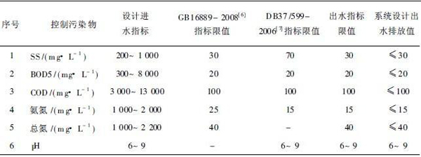 系統設(she)計(ji)日處理量80m3. 設(she)計(ji)進水(shui)指(zhi)標(biao)(biao)及出(chu)水(shui)排(pai)放指(zhi)標(biao)(biao)見表1 所(suo)示. COD、BOD、SS、氨氮、總氮及pH 等為(wei)污染排(pai)放主要控制指(zhi)標(biao)(biao),第(di)(di)四列(lie)及第(di)(di)五列(lie)分別為(wei)以上各指(zhi)標(biao)(biao)在GB16889- 2008及DB37 /599-2006中的排(pai)放限制,第(di)(di)六列(lie)為(wei)兩(liang)標(biao)(biao)準的較嚴格值,為(wei)保證(zheng)出(chu)水(shui)達標(biao)(biao),本(ben)設(she)計(ji)各污染物排(pai)放值(第(di)(di)七列(lie))應低于相(xiang)應第(di)(di)六列(lie)限值.