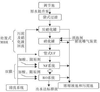 圖1 MBR + 雙(shuang)膜法(NF/RO)組(zu)合工(gong)藝(yi)流程圖