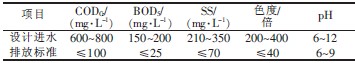 該(gai)企(qi)業車間排放的污水具有以(yi)下特點:(1)受訂單影響水質、水量波動大,設(she)計(ji)水量為5 000 m3/d;(2)色度深;(3)廢水的BOD5/CODCr偏低,可生化(hua)性差。設(she)計(ji)進(jin)水水質及排放標準如(ru)表1 所(suo)示。