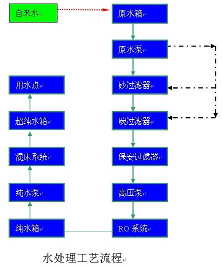 原水采用深圳自來水,一級處理工藝為砂碳技術,去除懸浮物顆粒,二級處理工藝為RO反滲透技術,三級處理工藝為混床技術。