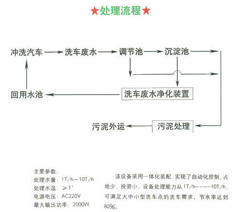 JC系列洗車廢水凈化裝置采用一體化裝配,實現了自動化控制,占地少、投資小,設備處理能力從1T/h-10T/h,可滿足大中小型洗車點的洗車需求。節水達到80%。