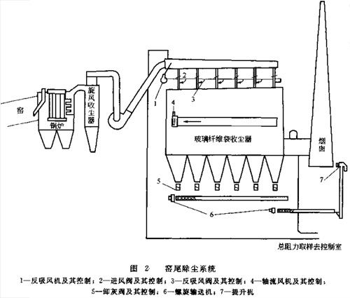 后經本公司專家設計和指導,采用微機控制的玻璃纖維袋除塵器。改造后的工藝流程如圖2所示。旋風筒出口的含塵煙氣道過窯尾排風機壓入玻璃纖維袋收塵器,經濾袋過濾后,干凈氣體沿排煙道進入煙囪。當除塵器運行阻力上升至限定值時,袋式除塵器就開始清灰、卸灰、回灰等一系列動作,整個過程均是自動控制。