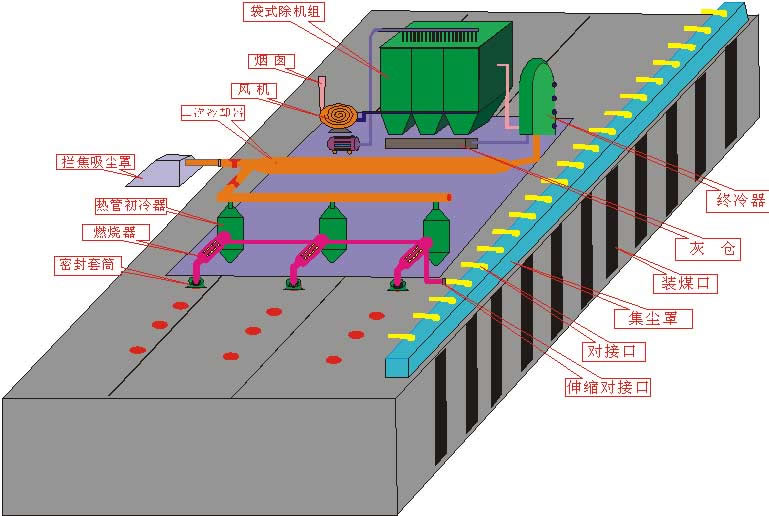 本移動工作站,配置的各功能如初冷器、二次冷卻器、終冷器、布袋除塵機組、風機等結構原理均同CL-Ⅱ型系統。所不同點是將裝煤除塵系統、出焦除塵系統共同設置在一臺爐頂移動工作站上,使設備綜合利用,降低了工程造價,比原設計的地面站系統降低造價1/2,噸焦運行成本為0.25元左右。并可穩定達到且低于國家二級環保排放標準;另一個不同點是在機側爐門上方設置了小吸塵罩,可有效的對在裝煤過程中機側爐門所散發的煙塵進行收集,其余均同CL-Ⅱ型設計。