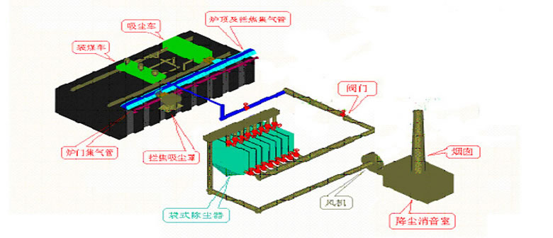 本系統是在爐頂設一道單管雙開門的輸送管道系統,并聯接至地面站,裝煤和出焦所產生的粉塵氣體分別通過特設的開、閉式接口門進入輸送總管后,再送入地面站除塵系統,凈化后的氣體通過風機進入煙囪排入大氣。本系統的苯并芘消解技術同MXC.JXC-4.3-G系統相同。