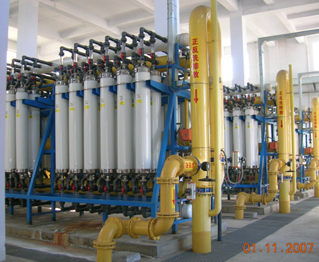 本工藝采用內壓式膜組件。該超濾膜由親水性的聚醚砜中空纖維組成的,每一根超濾膜元件由上千根中空纖維組成的纖維束,截留分子量為100,000道爾頓。本工程采用錯流過濾的方法,超濾系統的設備包括超濾主機、超濾供水泵、袋式過濾器、化學清洗裝置等。