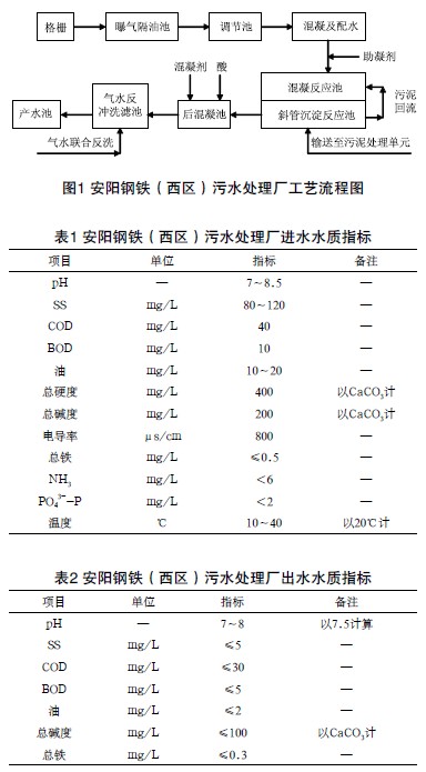 安陽鋼鐵(西區)污水處理廠前處理按12萬m3/d設計,一期工程8.4萬m3/d,二期工程3.6萬m3/d,其核心處理單元為混凝沉淀和氣水反沖洗濾池,并充分考慮了鋼鐵污水排放的間斷性,設置了停留時間150min的調節池(見圖1)。在污水進入調節池之前,先通過格柵去除較大的漂浮物和懸浮物,再經過曝氣隔油池達到氧化Fe2+和除油的目的;調節池出水經提升泵送至高密度沉淀池的混凝配水池內,先投加混凝劑和石灰乳,通過電機攪拌混合,然后投加PAM作為助凝劑,在配水池內形成良好的礬花;再由配水系統經底部進入高密度沉淀池,沉淀池下部設置攪拌刮泥機,水面布置斜管,控制斜管上升區流速在14m/h以下。沉淀池出水進入后混凝池,攪拌加入混凝劑并加酸調節pH值;混凝池出水進入氣水反沖洗濾池,氣水反沖洗濾池按6池設計,每池2格,濾池正常濾速控制在8m/h以下,1格反洗時強制濾速不超過9m/h,當達到設計壓差或設定反洗間隔時間后,進行氣水聯合反洗。污水處理廠的進水水質指標和出水水質指標見表1和表2。