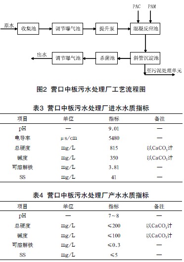 營口中板污水處理廠按3萬m3/d設計,采用傳統的混凝沉淀工藝為核心(見圖2)。原水進水經格柵后流入調節池(內置曝氣系統),水力停留時間約1小時。經提升泵提升后進入混凝池,攪拌加入PAC和PAM,經花墻配水后進入斜管沉淀池,控制斜管上升區流速。出水投加殺菌劑,控制后續單元余氯值,并加酸調節pH值至中性。沉淀池出水流入氣水反沖洗濾池,濾池設計出水懸浮物濃度≤5mg/L。污水處理廠的進水水質指標和出水水質指標見表3和表4。